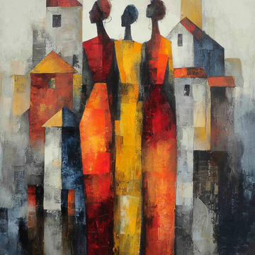 This is a vibrant and compelling abstract-figurative painting featuring three stylized figures set against a...