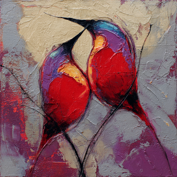 This is an emotive and heavily textured abstract-figurative painting featuring two stylized birds interacting tenderly.Subject:...