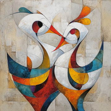 This is a highly stylized, abstract painting featuring two birds, resembling swans or tropical birds,...