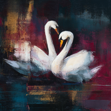 This is a powerful and atmospheric painting depicting two swans forming a heart shape, set...