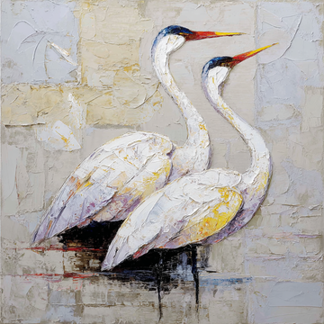 This is a bright and highly textured painting of two graceful birds, likely stylized herons...