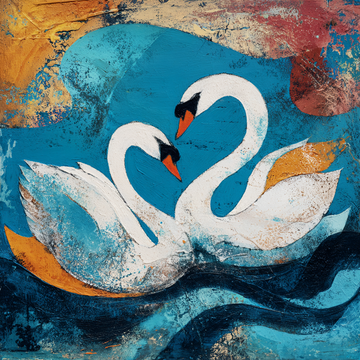 This is a bold, decorative, and highly stylized abstract painting featuring two swans whose forms...