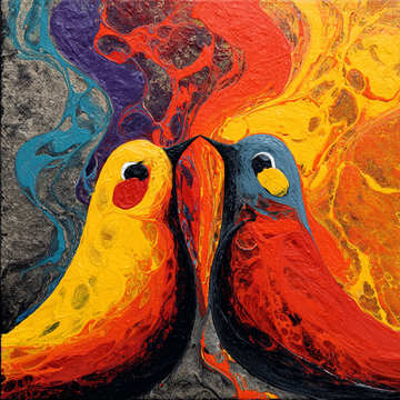 This is a dynamic and highly abstract painting depicting two stylized birds facing each other,...