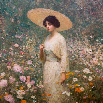 A romantic and painterly portrait of a woman set in a lush garden, likely late...