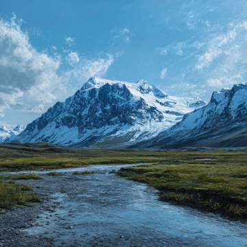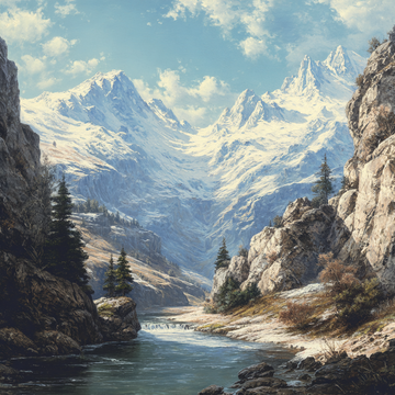 This is an expansive and richly detailed landscape painting, combining the grandeur of snow-capped mountains...
