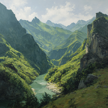 This is a sweeping, traditional landscape painting depicting a deep, verdant mountain valley with a...