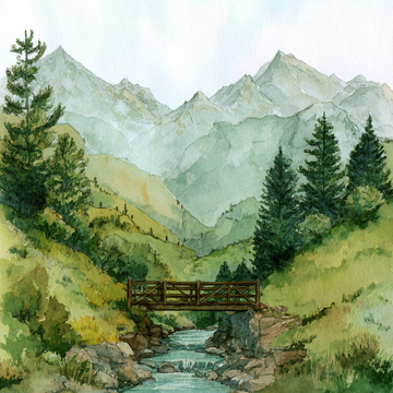 This is a serene and painterly landscape, rendered in a detailed watercolor style that captures...