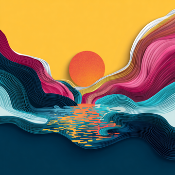 This is a dynamic painting, highly graphic art, and colorful abstract landscape of sunset art...