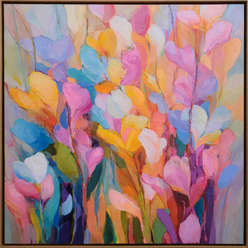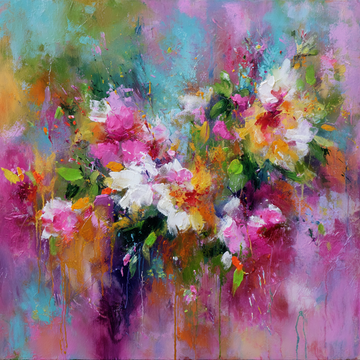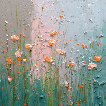 This is an abstract floral painting characterized by a gentle color palette and heavy surface...