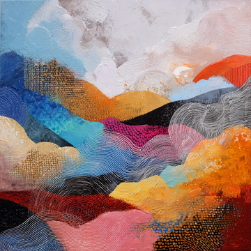 The image is a dynamic, highly textured abstract painting that suggests a landscape of rolling...