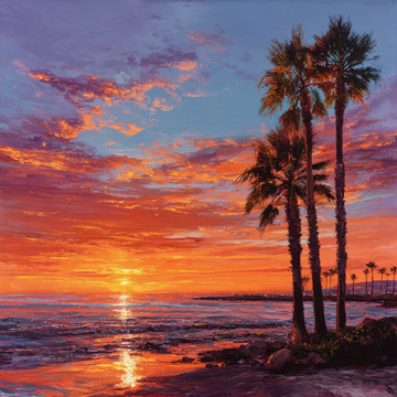 An expressive painting depicting a dramatic sunset over a tropical coastline.The sky is fiery orange...