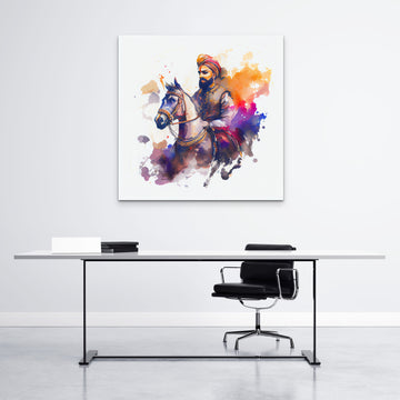 This lovely print depicts a traditional Indian man riding a horse. The man is dressed...