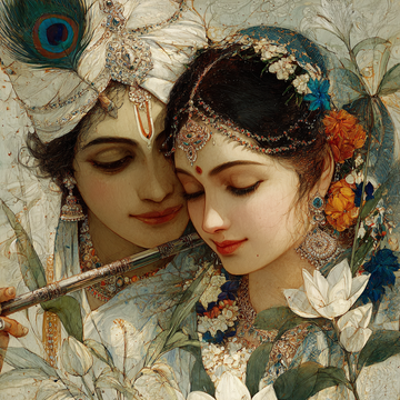 A tender and highly detailed portrait of Radha and Krishna rendered in a soft, classical...