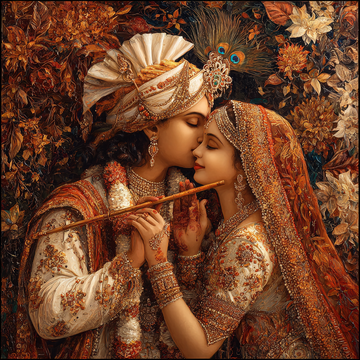 This exquisite oil color print captures the divine love between Radha Krishna in radiant hues...