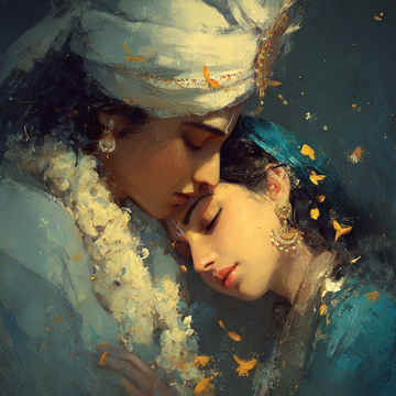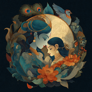 A deeply intimate and realistic portrait of Radha and Krishna rendered in a classical fine...