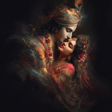 A deeply evocative and dark portrait of Radha and Krishna in a close, tender embrace,...