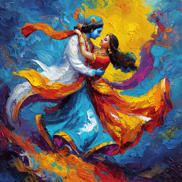 A passionate and dynamic depiction of Radha and Krishna engaged in a swirling, ecstatic dance...