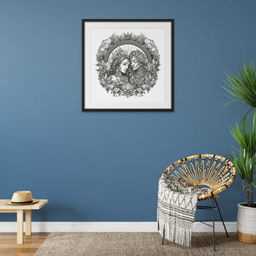 Introducing our exquisite "Divine Love in Zoodle Art" print featuring a detailed black and white...