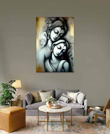 This modern art print depicts the faces of Radha and Krishna in black and white...