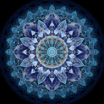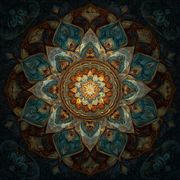 This is a highly intricate, symmetrical, and ornate circular design (mandala) with a deep, dramatic...