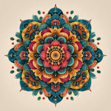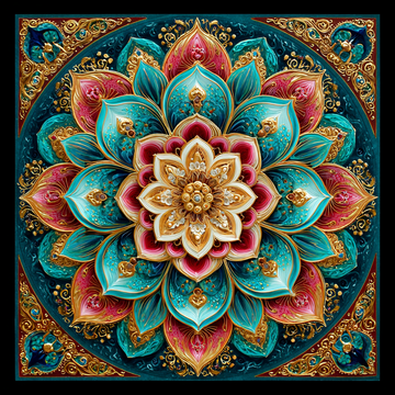 This is a highly intricate, symmetrical, and circular design (mandala) focused on a stylized lotus...