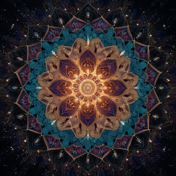 This is a highly complex, symmetrical, and luminous design (mandala) set against a dark, cosmic...