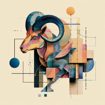This is a modern, graphic illustration focusing on the head and horns of an Aries...