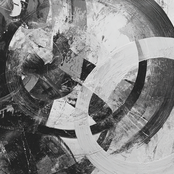 A captivating abstract composition in black, white, and shades of gray, featuring layered circular brushstrokes...