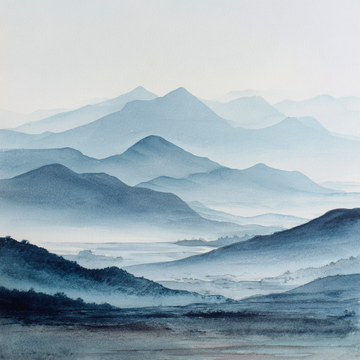 A serene, atmospheric painting depicting a valley surrounded by multiple layers of rolling mountains.The style...