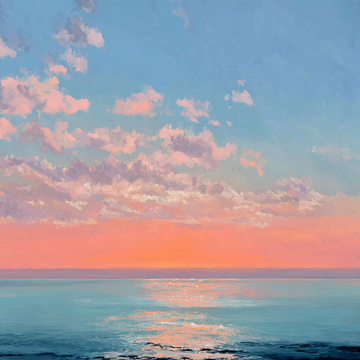 A calming, impressionistic painting of a sunset or sunrise over a calm body of water,...