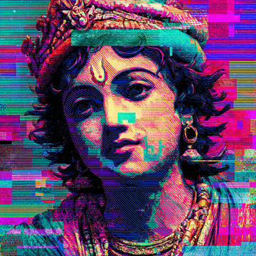 Subject: A stylized portrait of a figure resembling the Hindu deity Lord Krishna, identifiable by...