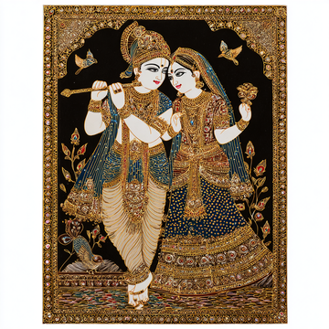 A highly intricate and decorative depiction of Radha and Krishna, distinguished by an extremely detailed...