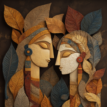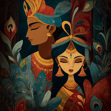This is an abstract, graphic illustration of two figures' profiles overlaid, suggesting Radha and Krishna,...