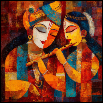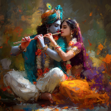This is an abstract, mixed-media style painting of Radha and Krishna, characterized by a heavily...