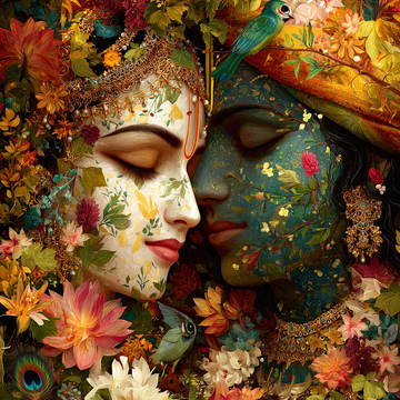 A highly ornate and detailed depiction of Radha and Krishna in a serene, intimate embrace,...