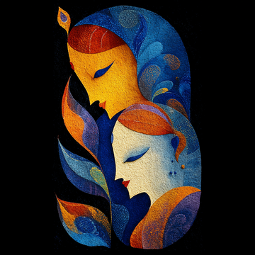 A stylized, close-up portrait featuring the profiles of two figures, likely Radha and Krishna, rendered...