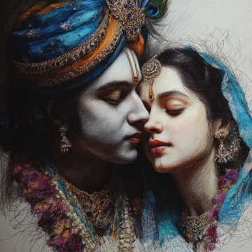 A deeply intimate and realistic portrait of Radha and Krishna rendered in a classical fine...