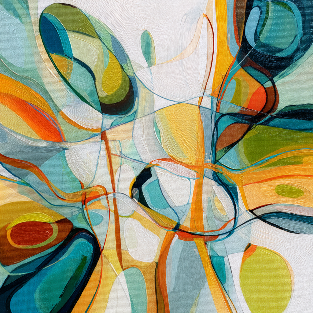 A vibrant abstract oil painting characterized by flowing lines and organic shapes.