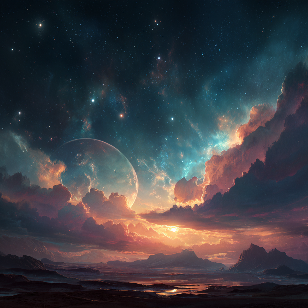 A digital painting of a futuristic cosmic landscape with planets and stars glowing nebula clouds surreal lighting vibrant color palette fantasy art style.