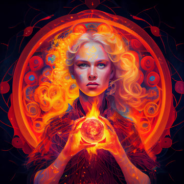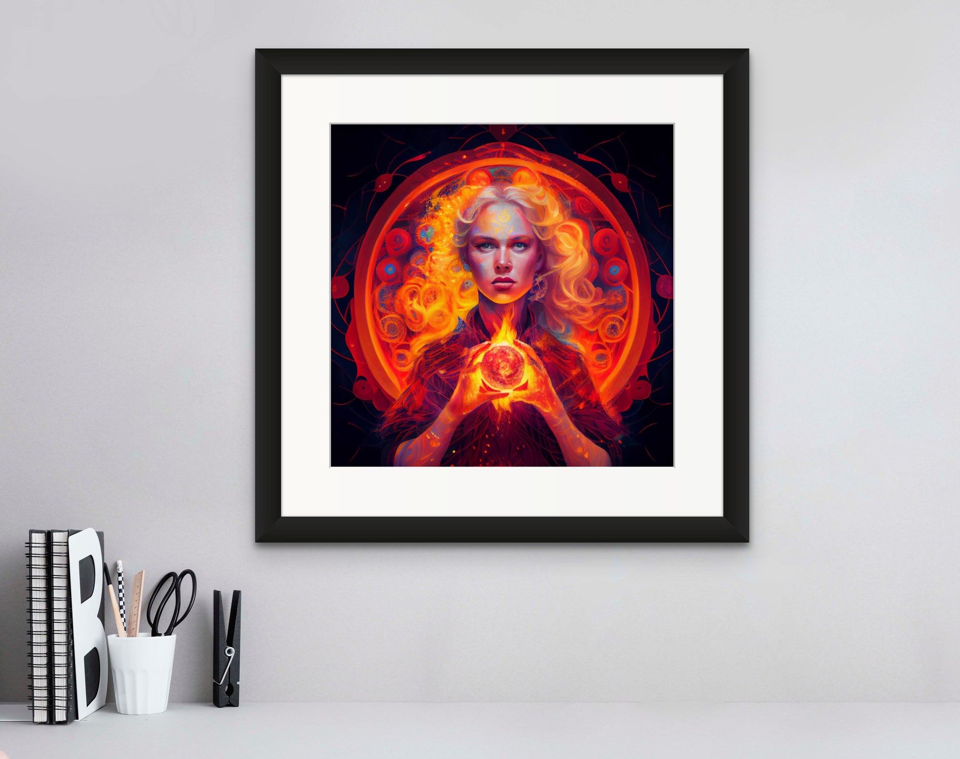 - This stunning print features a powerful image of a woman holding a blazing fireball in her hand. The flames emanating from the fireball are brilliantly depicted, with warm tones of orange, red, and yellow blending together to create a mesmerizing visual display.