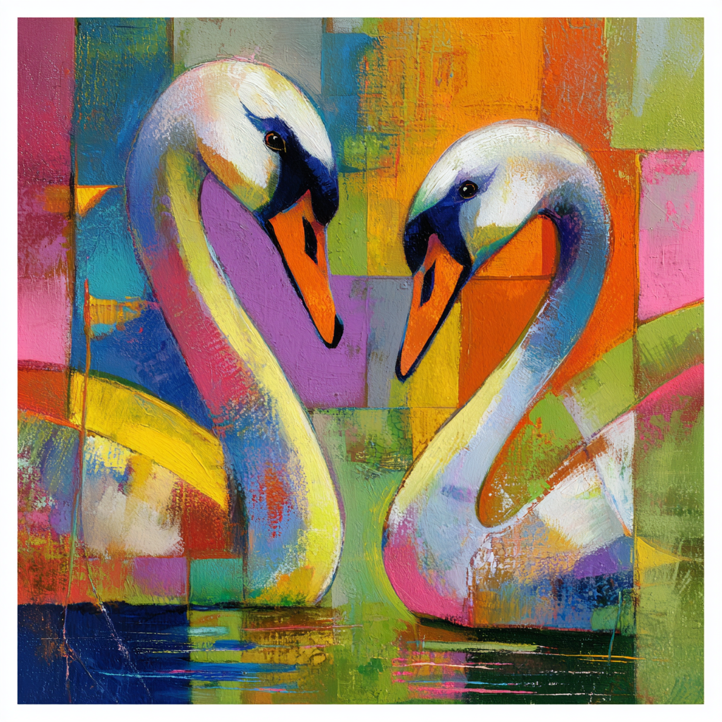 This is a vibrant, abstract-figurative painting featuring two swans whose necks curve toward each other, symbolizing unity.