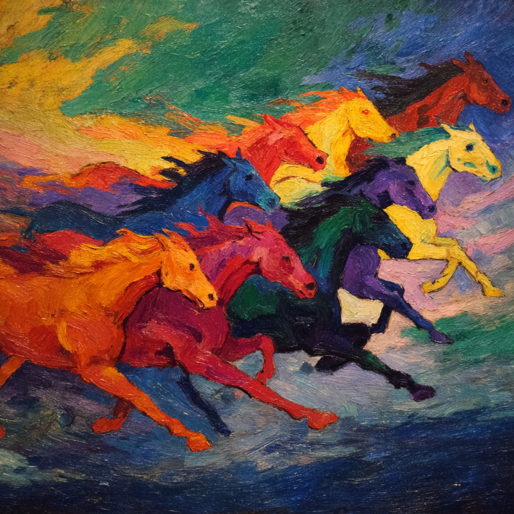 Color Palette: This image uses a high-key, saturated palette across the color spectrum: fiery orange, deep red, cobalt blue, violet, and sunny yellow. Each horse is a distinct, bold color, with the background being a mix of swirling, atmospheric tones that blend with the colors of the animals.
