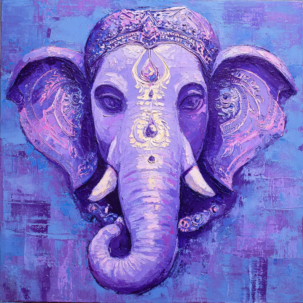 Color Palette: The artwork is immersed in a vibrant, monochromatic palette of blues, violets, and magenta-purples. The background consists of rough, vertical, and horizontal brushstrokes in darker indigo and cobalt blue, while Ganesha's face is rendered in brighter lavender and amethyst.