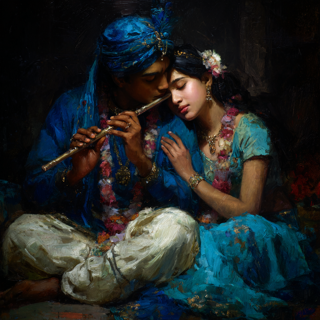 .A deeply intimate and romantic depiction of Krishna and Radha, seated together in a dark, interior setting, rendered in a dramatic, classical oil painting style (Chiaroscuro).