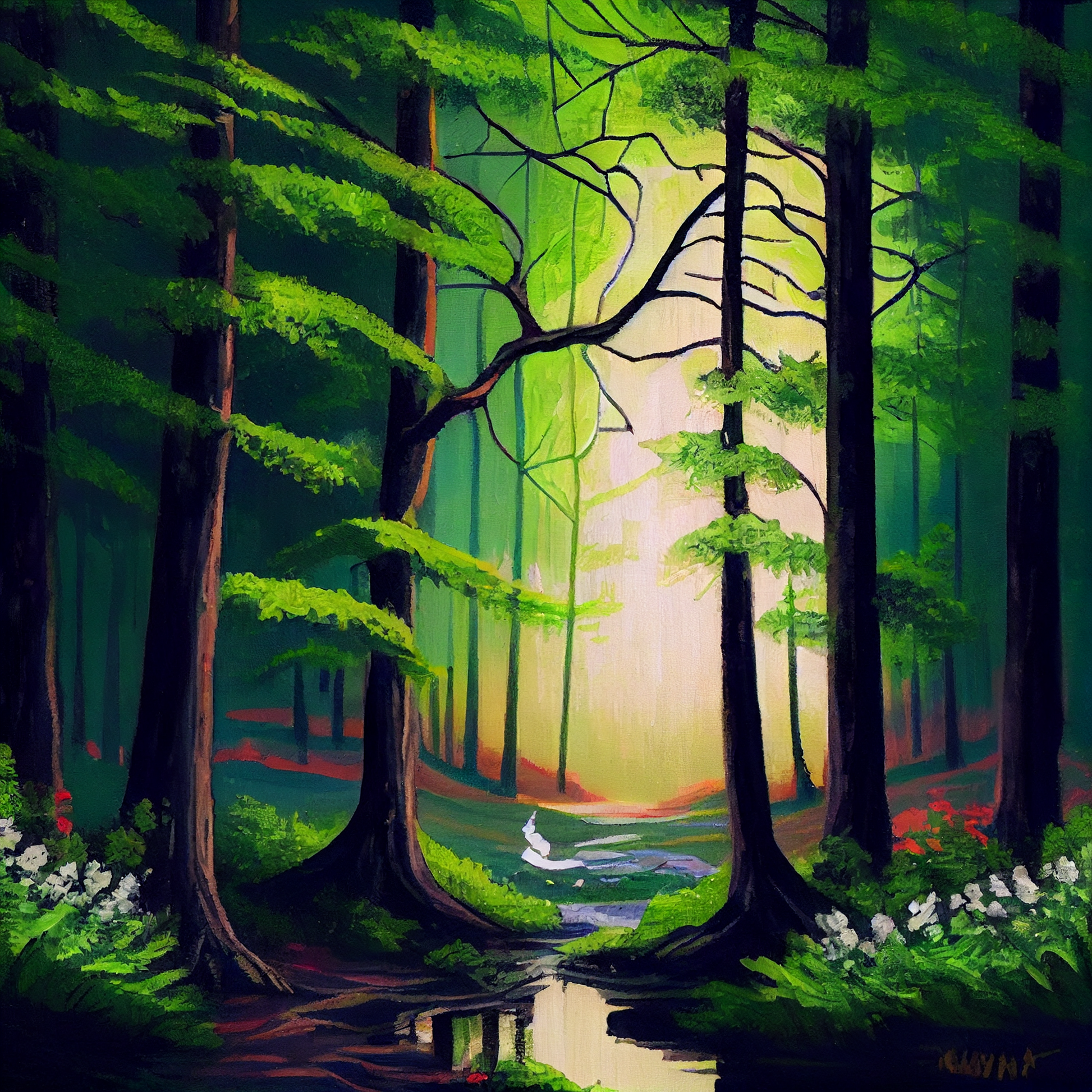 - The painting print showcases the natural beauty of an evergreen forest, focusing on the wildflowers that grow around the trees.
