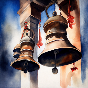 Sacred Chimes: A Watercolor Art Print of the Bells of a Hindu Temple