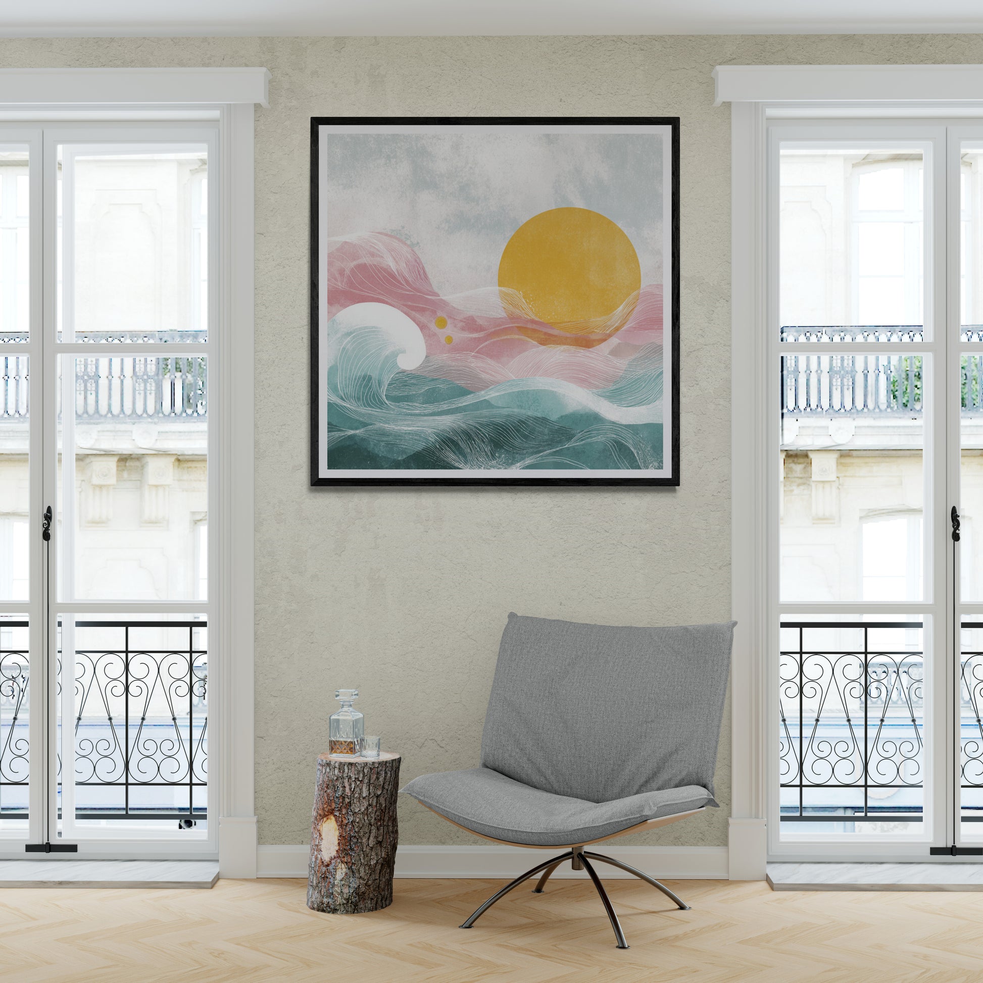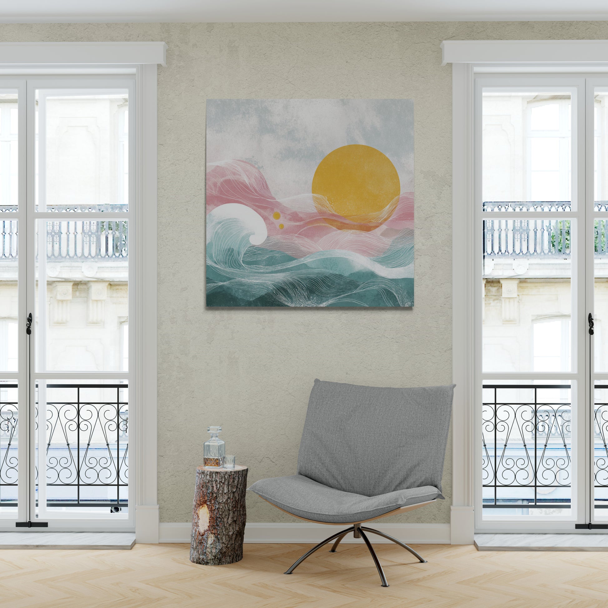 Composition: The foreground features sweeping, rhythmic waves in two main color blocks, with the large, muted sun acting as the central, grounding element in the upper half.