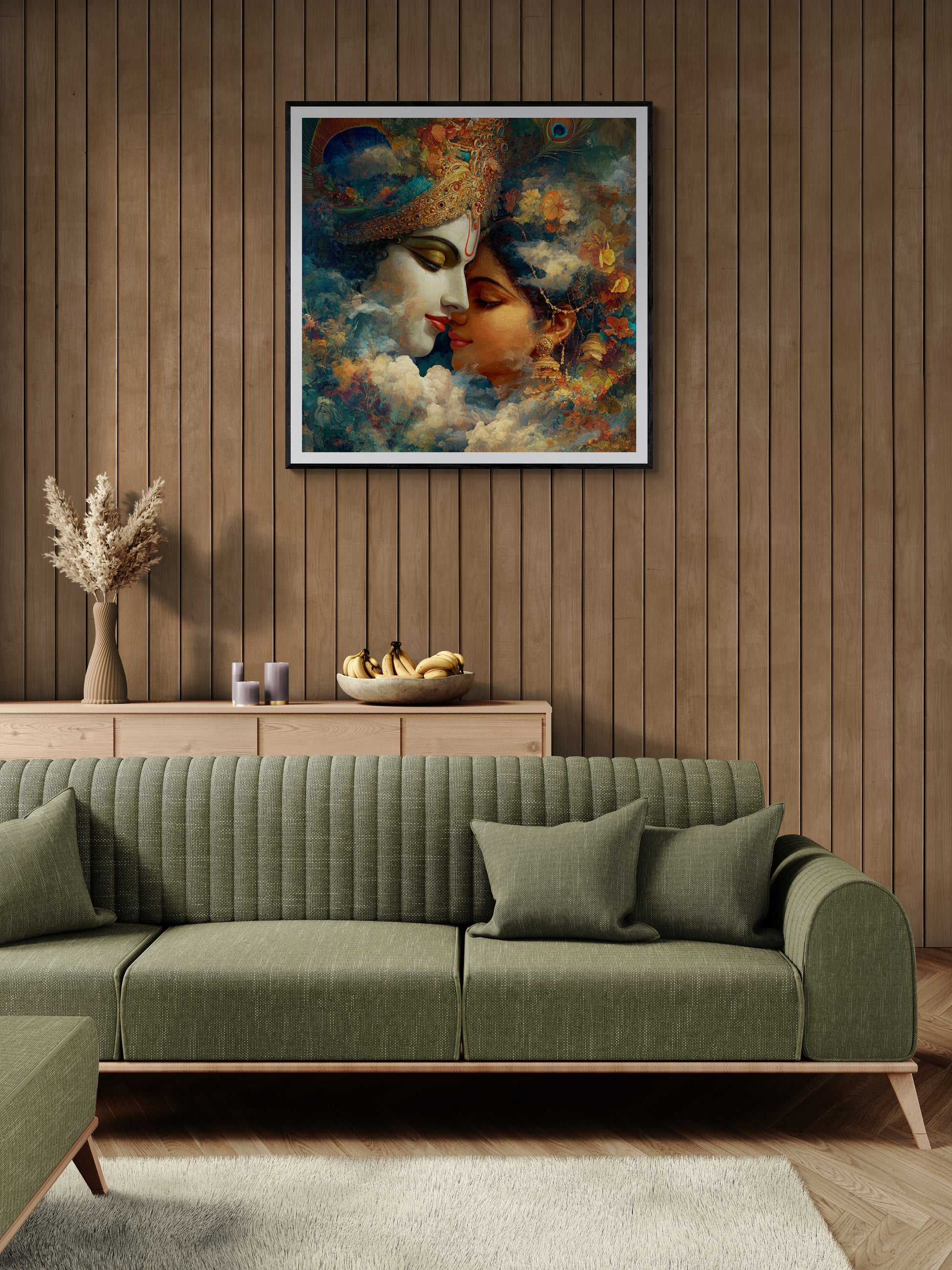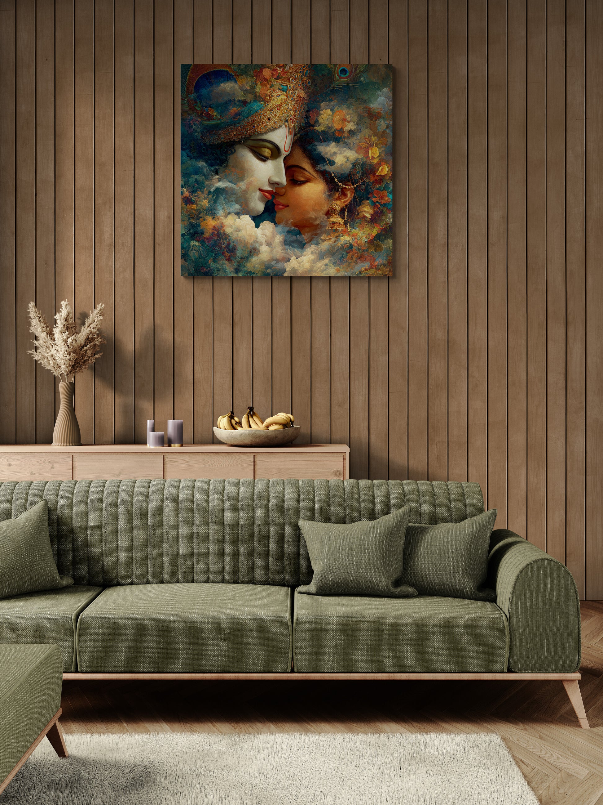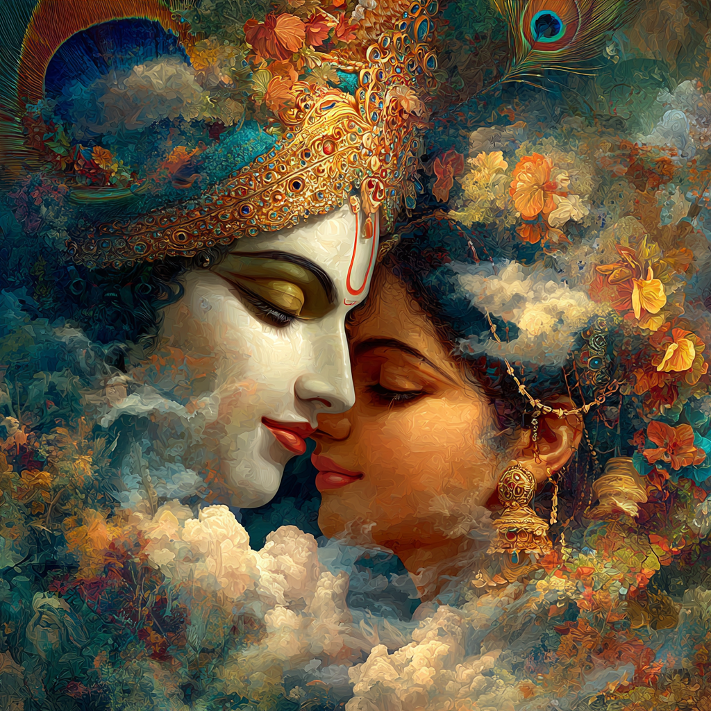The couple is leaning in for an intimate moment, their eyes closed in bliss, symbolizing the union of the individual soul (Radha) with the Divine (Krishna).