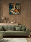 The composition is dominated by a vibrant, high-contrast color palette featuring deep blues, earthy greens, burnt oranges, and brilliant whites, creating a sense of drama and spiritual transcendence.