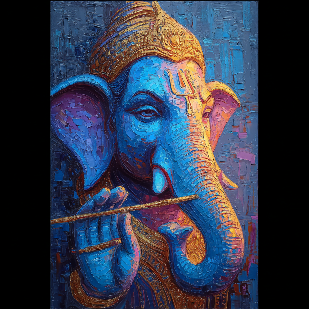 Subject: The head and upper torso of Lord Ganesha, unusually depicted playing a flute (or Bansuri), a musical attribute traditionally associated with Krishna. This representation is sometimes seen as Vighneshwara (the remover of obstacles) in a musical aspect.
